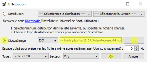 - 4 : Double-cliquez sur le fichier téléchargé, appelé unetbootin-windows-661.exe (le numéro détermine la version du logiciel, il peut changer au fil du temps), pour lancer le logiciel (de confiance, rassurez Windows sur ce point). Cochez "disqueImage" (ou appuyez sur i), puis cliquez sur "..." pour aller chercher "Ubuntu..." là où vous l’avez rangé (souvent dans le dossier "Téléchargements"). Vérifiez bien que le "lecteur" soit bien celui où vous avez branché votre clé (ici, D :/), puis cliquez sur OK. Un peu de patience, et vous avez votre clé !