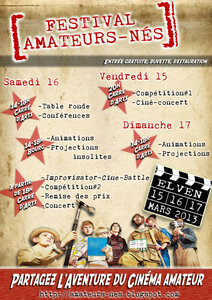 Le grand festival de Cinéma Amateur(coorganisé par Souliers) qui se déroulera les 15, 16 et 17 mars prochain à Elven (programme en queue de message) ouvre toujours ses coulisses aux curieux et passionnés qui voudraient faire partie de la fête. C’est votre cas ? Une réunion d’information des bénévoles aura lieu le Vendredi 15 février prochain à 19h à la mairie d’Elven (salle du conseil). Et si vous ne pouvez pas vous y rendre et que vous êtes d’ores et déjà intéressés, remplissez ce formulaire (et transmettez-le à vos amis potentiellement intéressés)