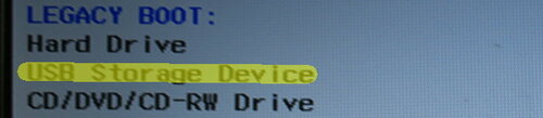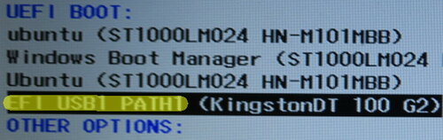 - 5 : Redémarrez votre ordinateur, en laissant la clé dans le port USB. Ensuite, il "suffit" de dire à votre ordinateur que, pour ce coup-ci, son système est sur la clé et non sur son disque dur. Pour cela, l’idéal est d’accéder au "boot menu". La plupart du temps, la procédure pour accéder à ce menu est visible quelques secondes quand vous allumez votre ordinateur. Vous trouverez des astuces générales et spécifiques à votre ordinateur sur ce guide (lien cliquable). Si votre ordinateur est récent (Windows 8 et plus), votre micro-logiciel de démarrage est donc certainement UEFI. Vous aurez donc quelque chose comme ceci :